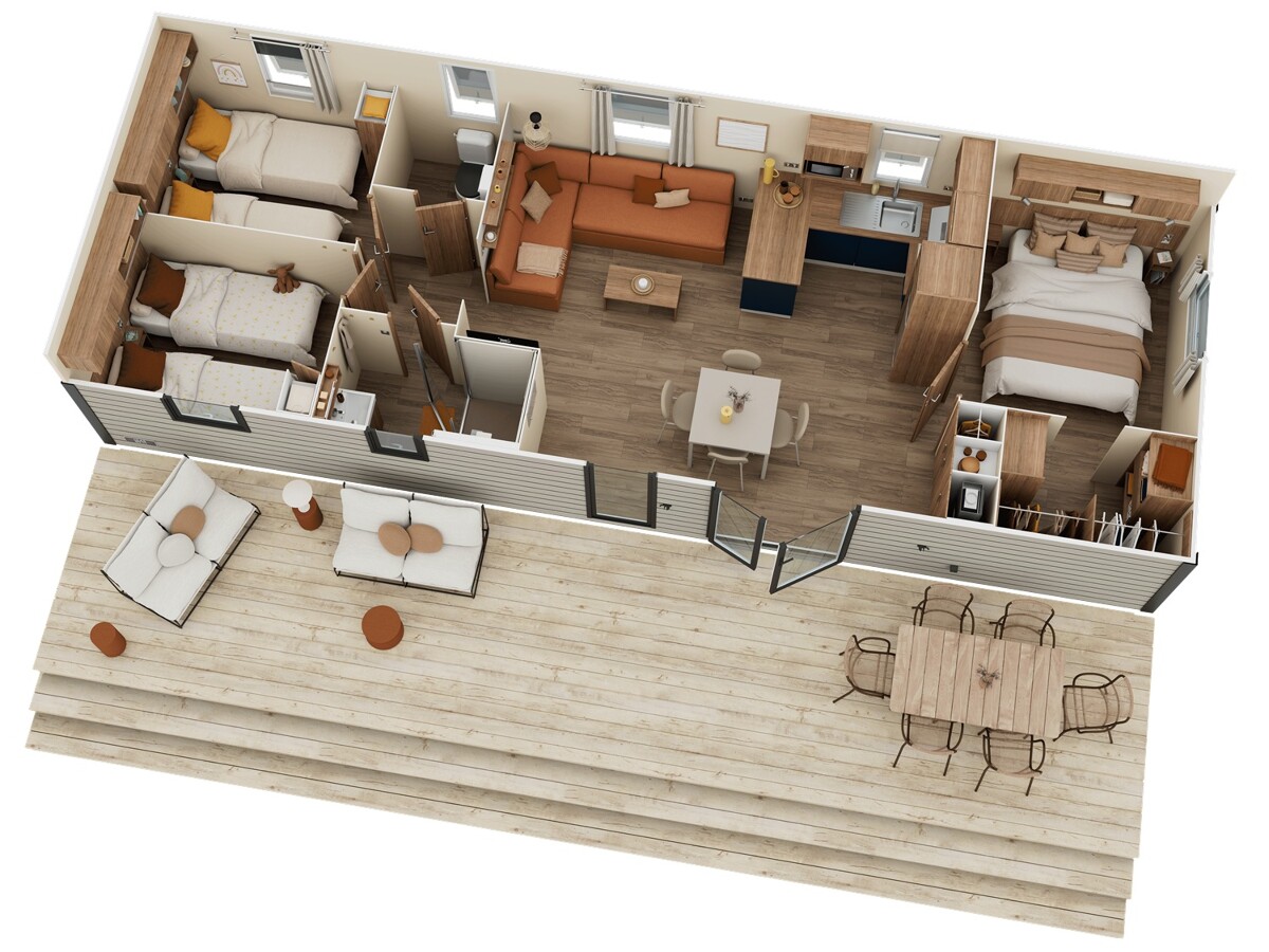 In diesem sehr hellen Modell können Sie die angenehme Atmosphäre der schönen Jahreszeit genießen; das Elternschlafzimmer mit seinem offenen Ankleideraum bietet großen Komfort, und es hat auch einen praktischen großen Aufbewahrungsschrank mit Hängeschrank und Regalen im Eingangsbereich.