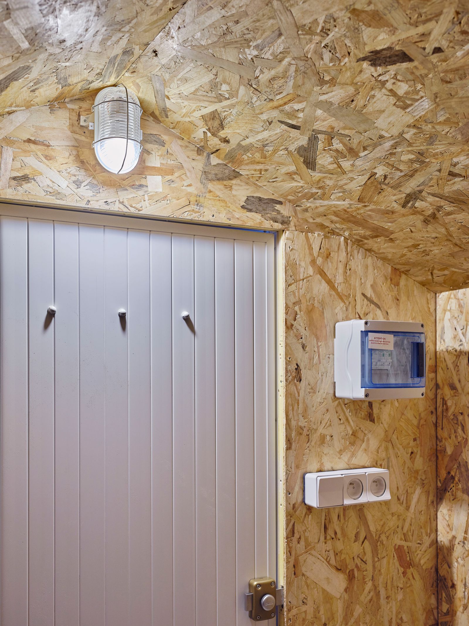 Innenausstattung mit Deck aus OSB3 und Lüftungsgittern. |