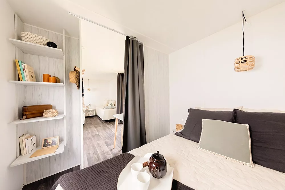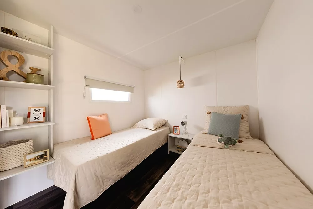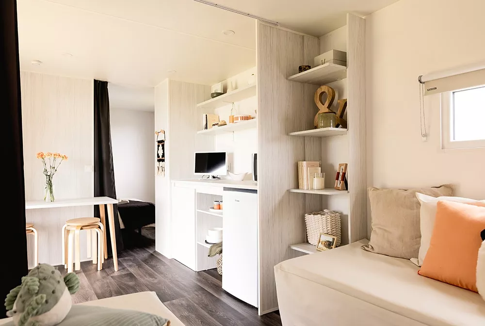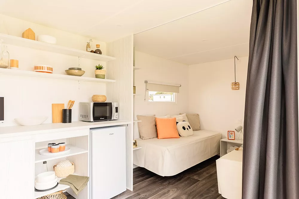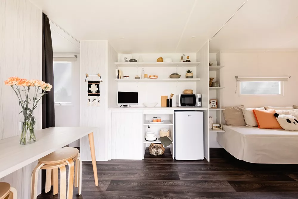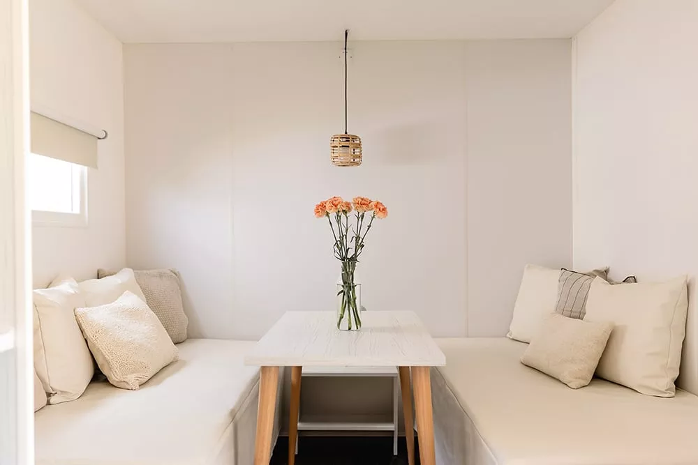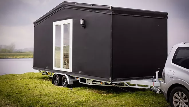 Sein ungewöhnliches Aussehen schafft einen klaren, naturorientierten Raum, der sich deutlich von dem in Zelten und Wohnmobilen unterscheidet. Es ist eine innovative Alternative zu klassischen Unterkünften, günstiger als ein Wohnmobil und komfortabler als ein Zelt.