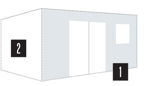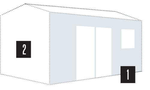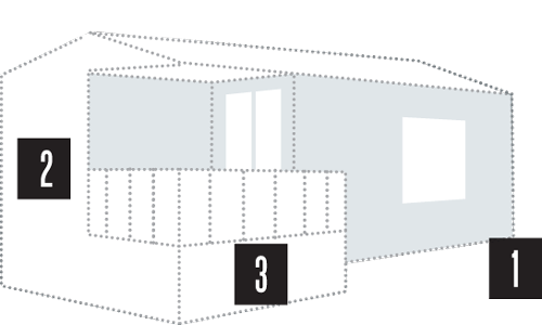 1. Anpassbare Vorderseite | 2. Drei Seiten mit Standardverkleidung Leinen | 3. Terrasse