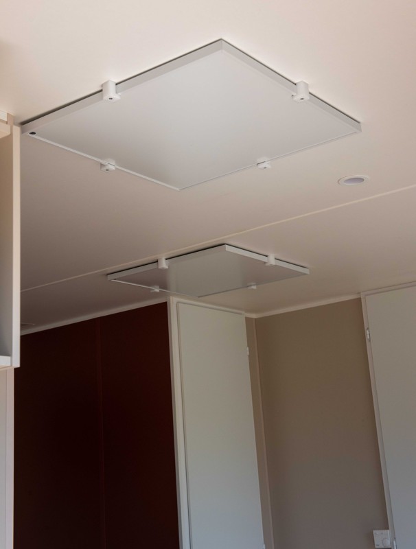 - Raumheizung durch an der Decke hängende Heizkörper (2 x 350 W)