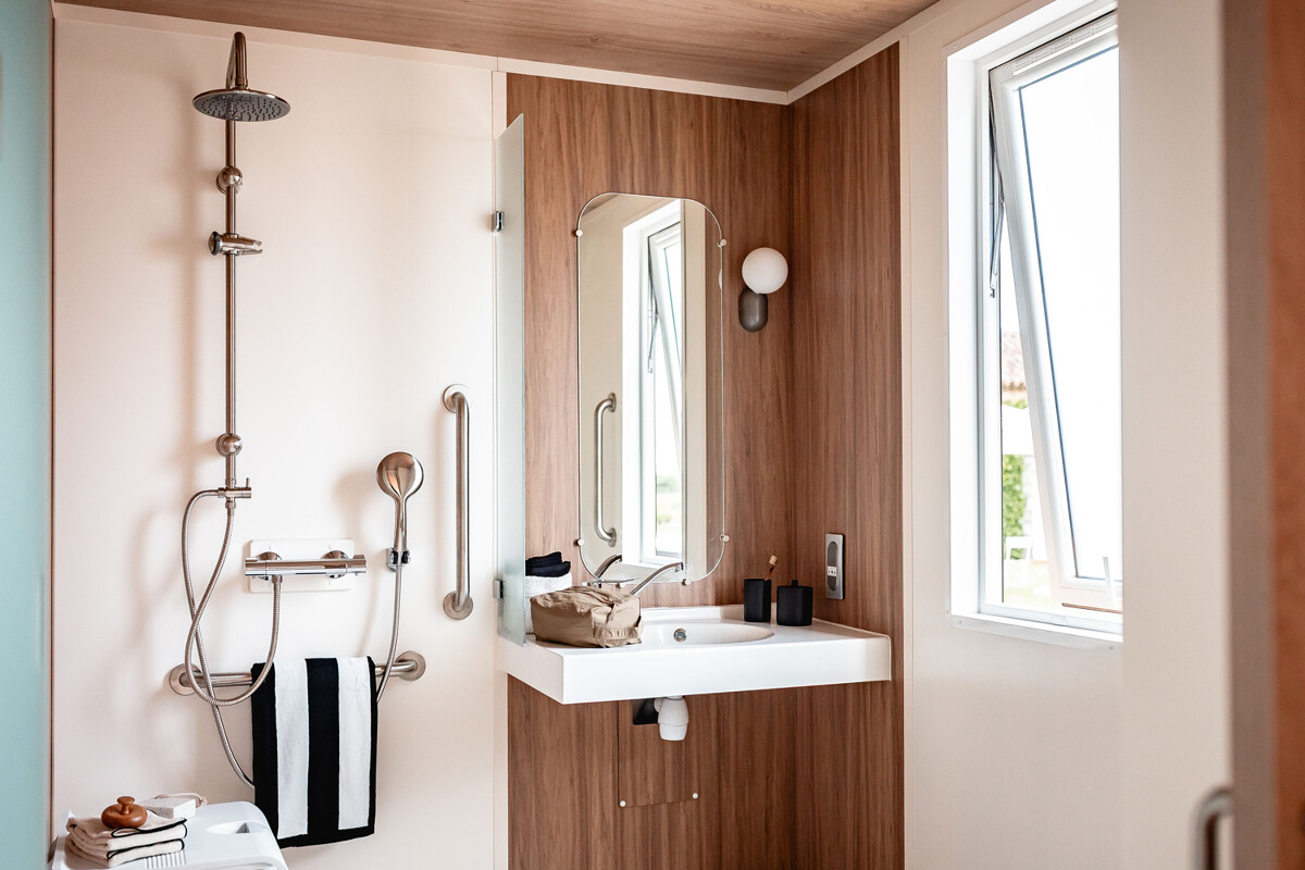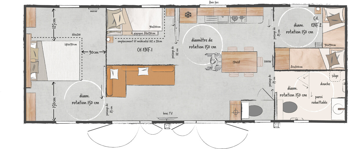 Beispiellose Geräumigkeit für das brandneue Mobilheim 1175 mit 3 Schlafzimmern! O'Hara setzt neue Maßstäbe mit einem 50 m² großen XXL-Grundriss, der speziell für Menschen mit eingeschränkter Mobilität konzipiert wurde. XXL-Duschraum, XXL-Wendebereiche, XXL-Türöffnungen von 83 cm, XXL-Hauptschlafzimmer. Maßgeschneiderter XXL-Komfort.