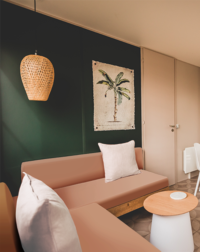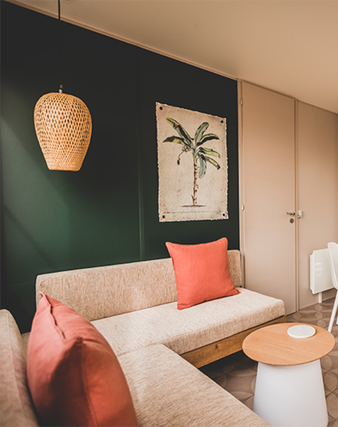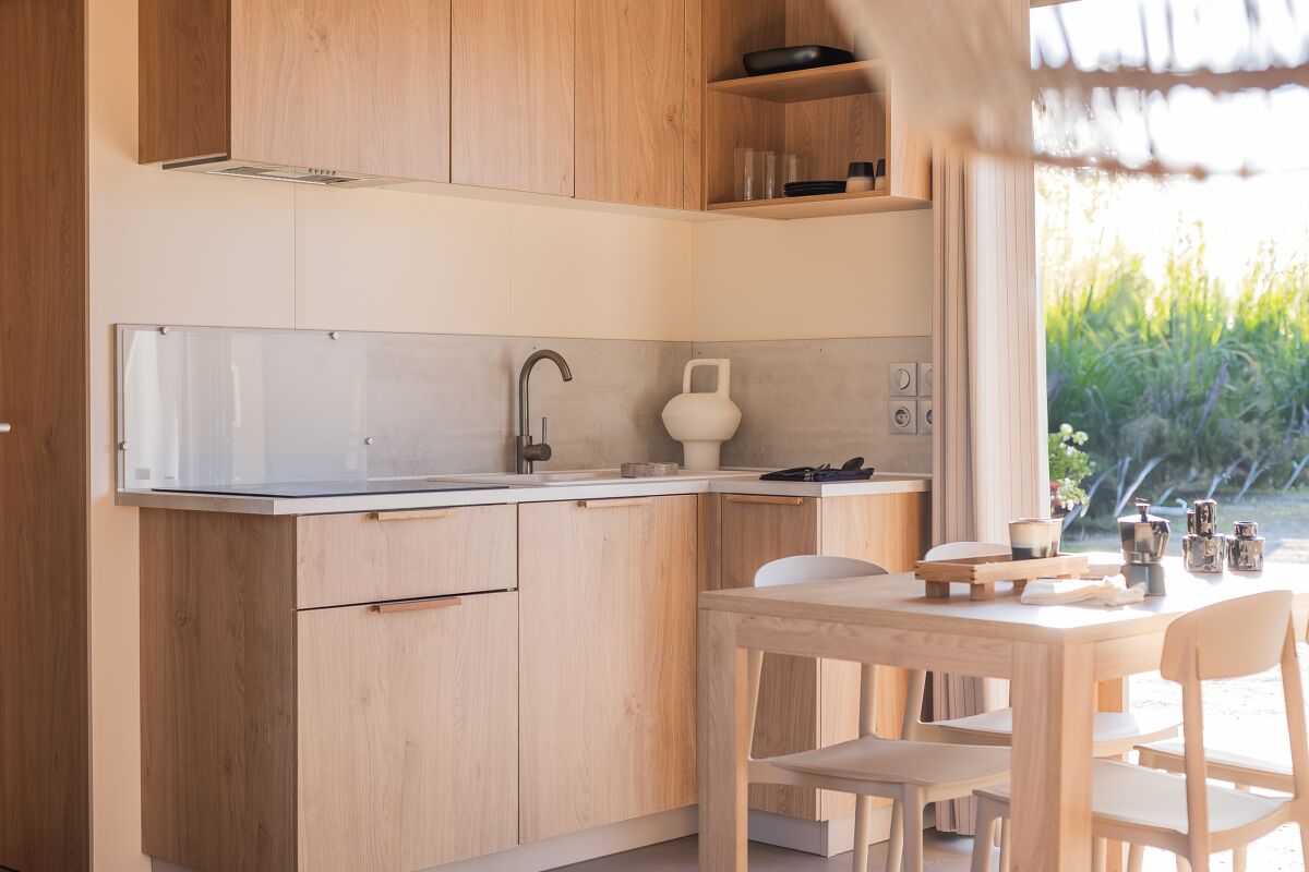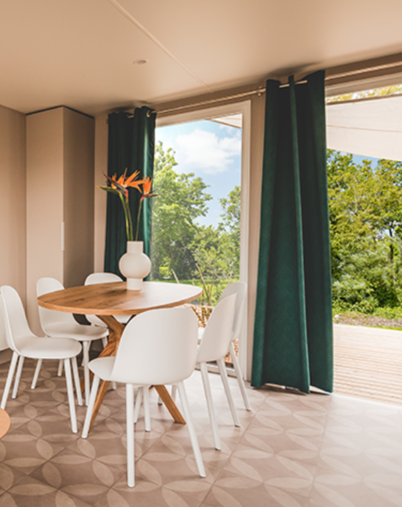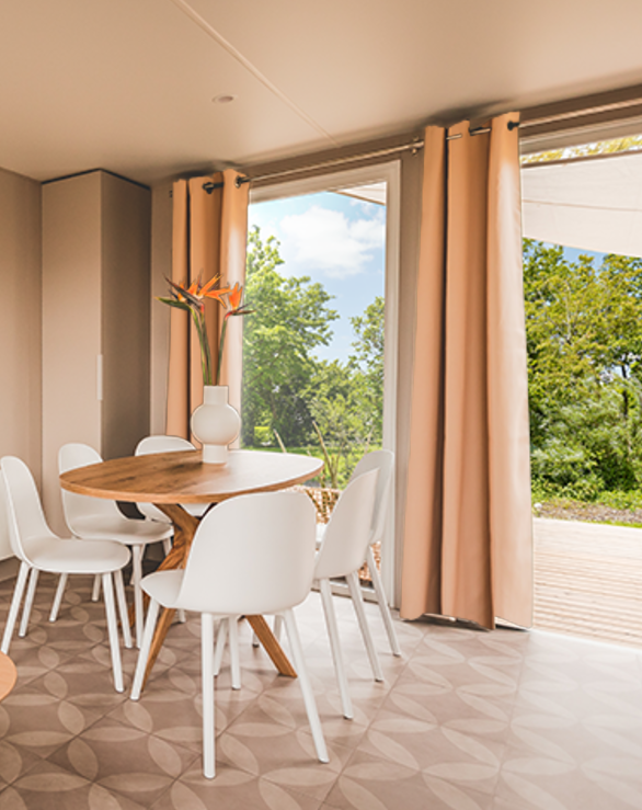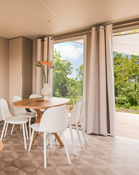 Sie erreichen die gartenseitige Terrasse des Modells 884-3 über die doppelte Fenstertüren auf der Rückseite. Sie werden das Elternschlafzimmer mit direktem Zugang zum Easy-Clean-Bad zu schätzen wissen. In diesem großen Spitzenmodell finden alle Ihre Urlauber bequem Platz.