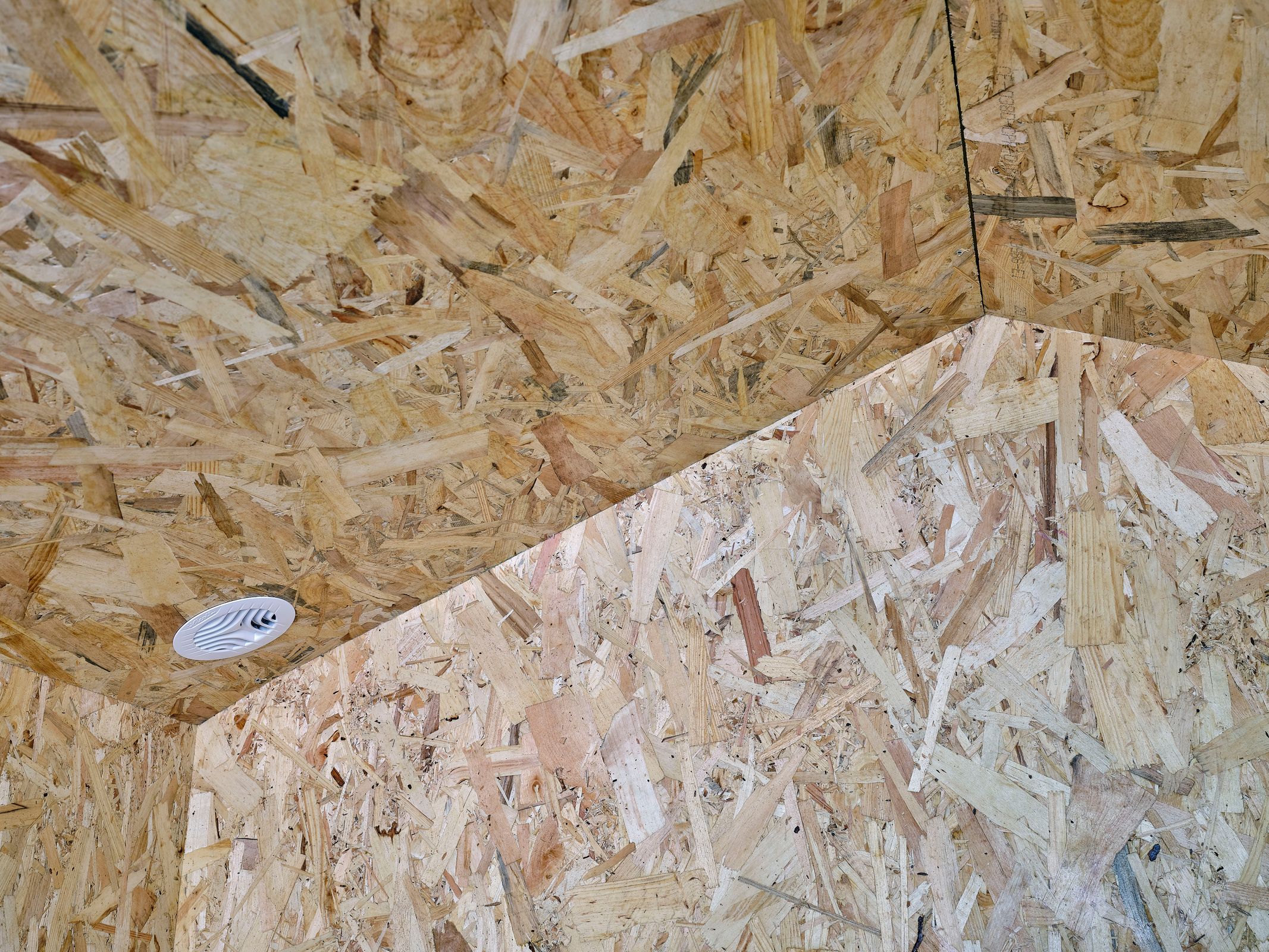 Innenausstattung mit Deck aus OSB3 und Lüftungsgittern. |