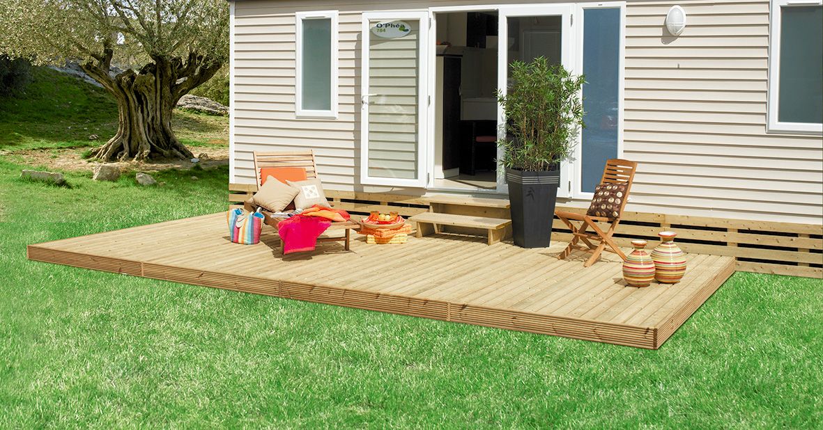 CASTEL 6.00 x 2.53 m - Optional mit 2-stufiger Treppe 100 cm & Unterbau für Mobilheim