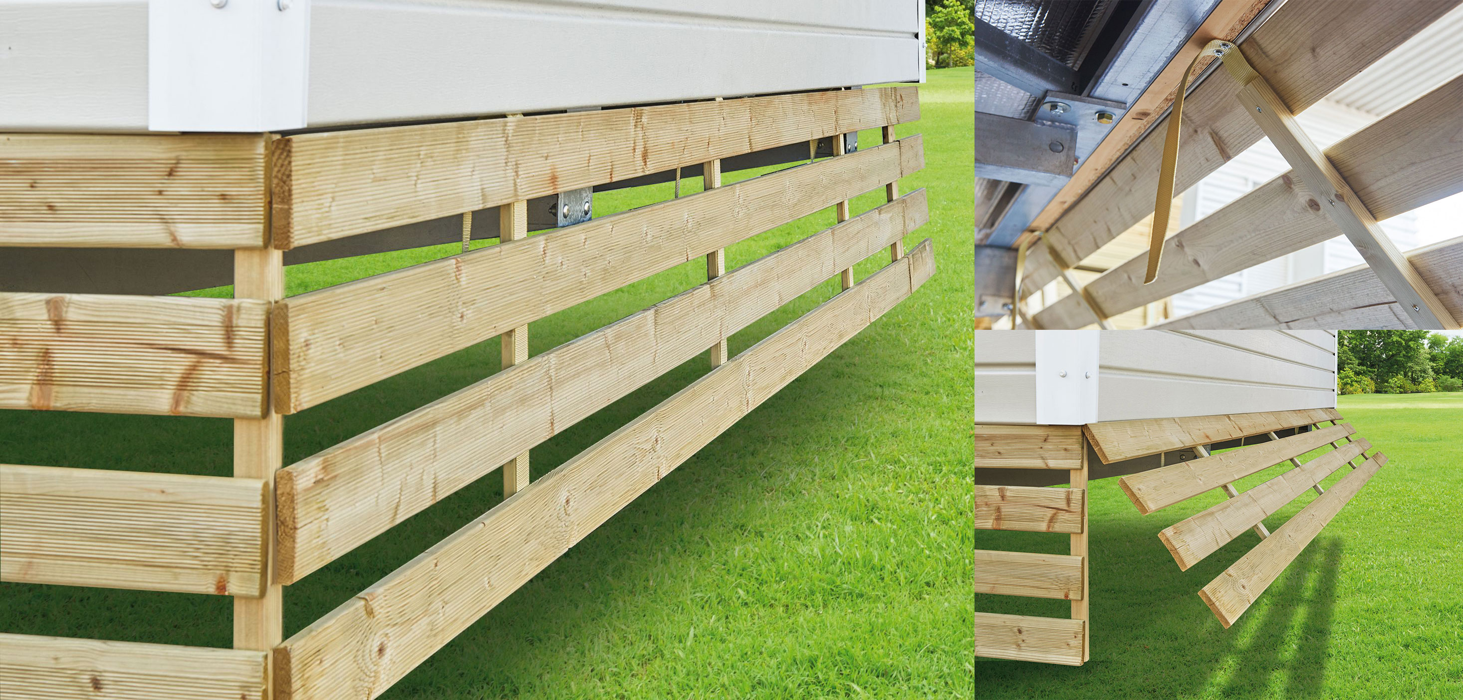 Kann lose oder vormontiert geliefert werden. Die Holzunterkonstuktionen verkleiden und schützen die Unterseite von Terrassen und Mobilheimen. Ästhetisch ansprechend und sicher für Kinder!